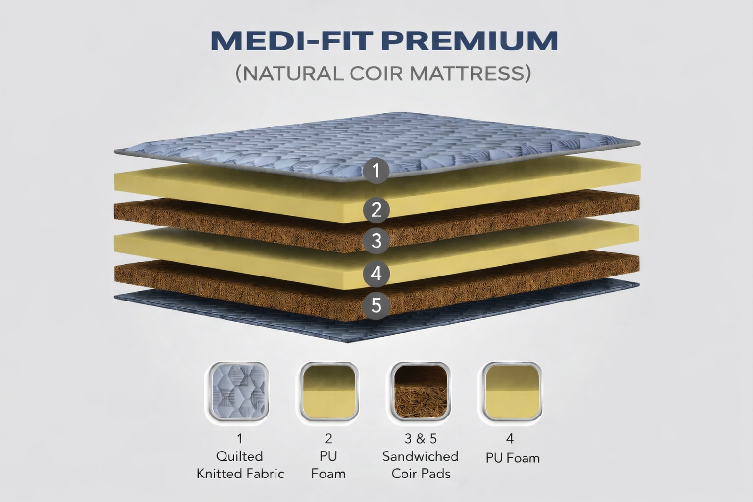 The MEDI-FIT PREMIUM (Natural Coir) Mattress is designed for people who prefer a firm, natural, and breathable sleep surface. It combines layered PU foam cushioning with sandwiched natural coir pads to deliver strong back support, enhanced airflow, and long-lasting durability.