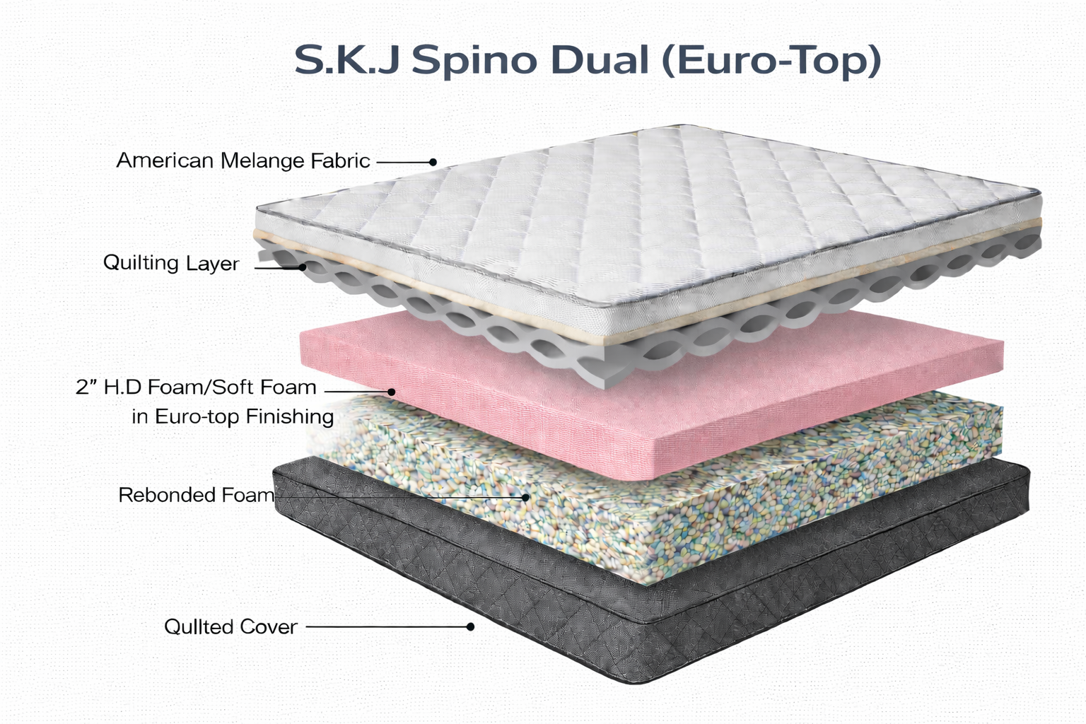 The S.K.J Spino Dual Euro-Top mattress is designed to deliver enhanced comfort with firm, long-lasting support. It features a premium American Melange Fabric on the top surface, combined with a soft quilted layer for added plushness. The 2″ HD Foam / Soft Foam Euro-top layer offers superior pressure relief and comfort, while the Re-bonded Foam core provides strong support, excellent durability, and helps maintain proper spinal alignment. A sturdy quilted bottom cover ensures overall mattress stability and longevity.