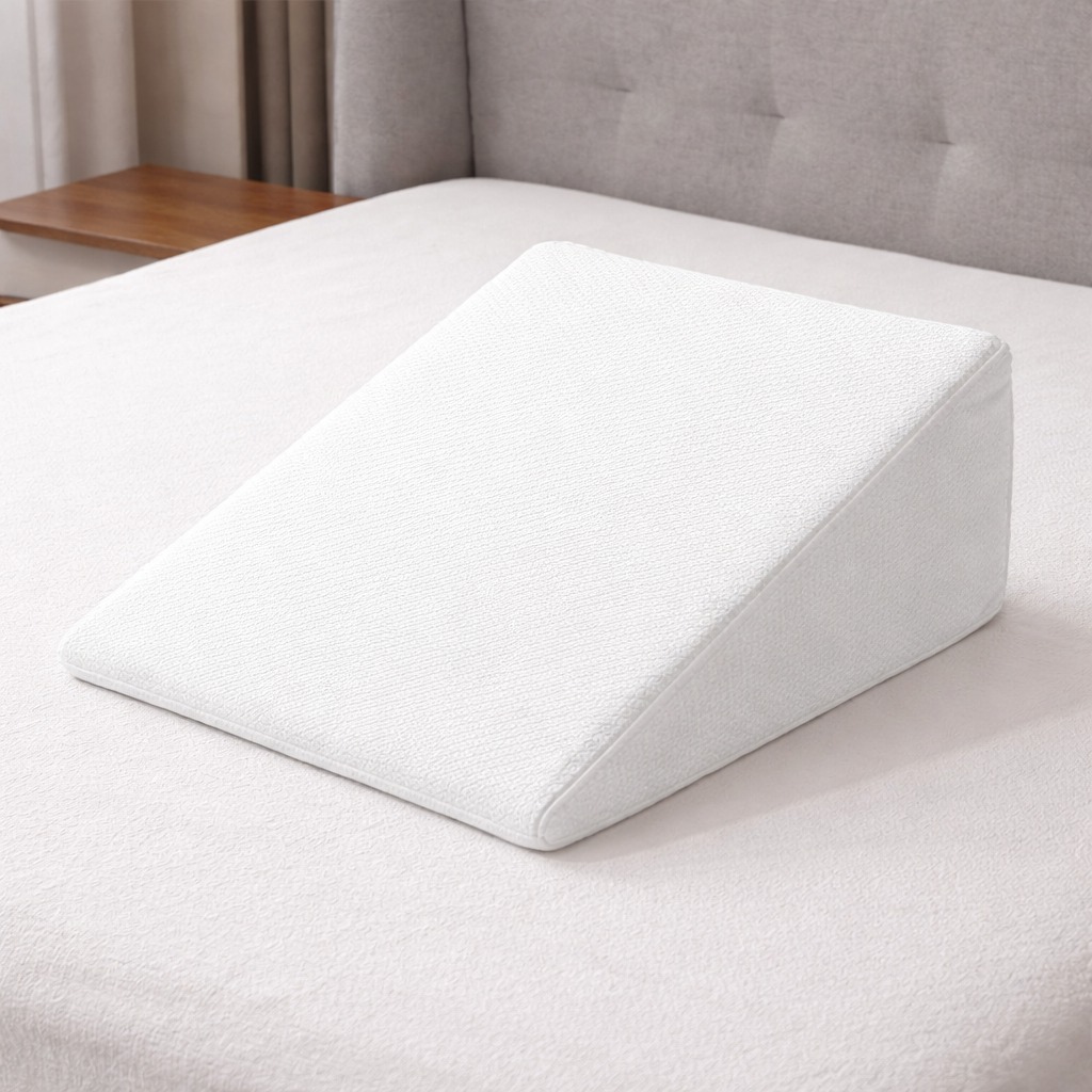 The pillow features a soft, pressure-relieving memory foam layer on top, combined with a firm, high-density base foam underneath. This dual-layer construction ensures both comfort and stability, helping maintain the correct incline throughout the night without collapsing.